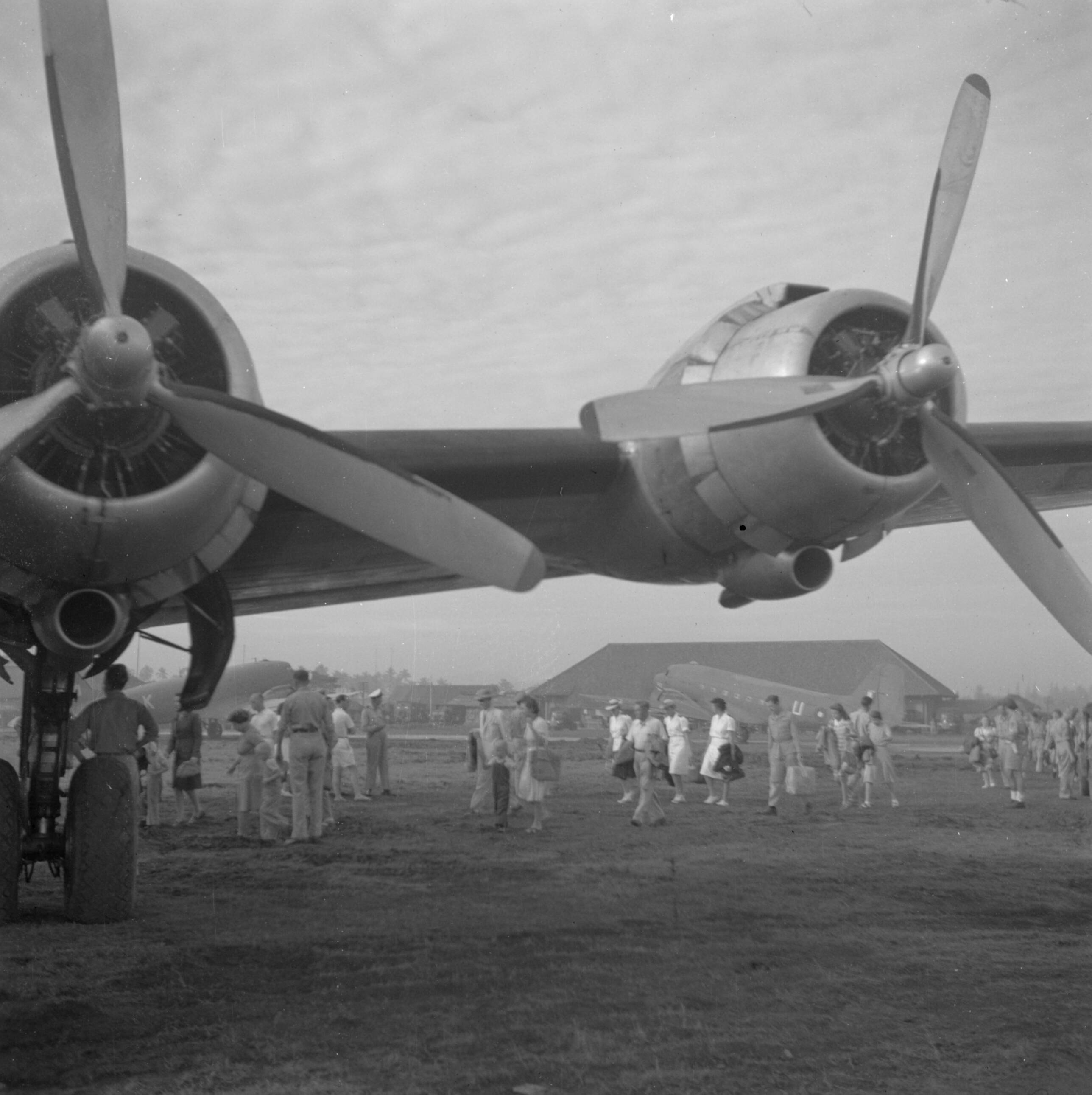 Repatrianten op weg naar het vliegtuig op Kemajoran, het vliegveld van Batavia