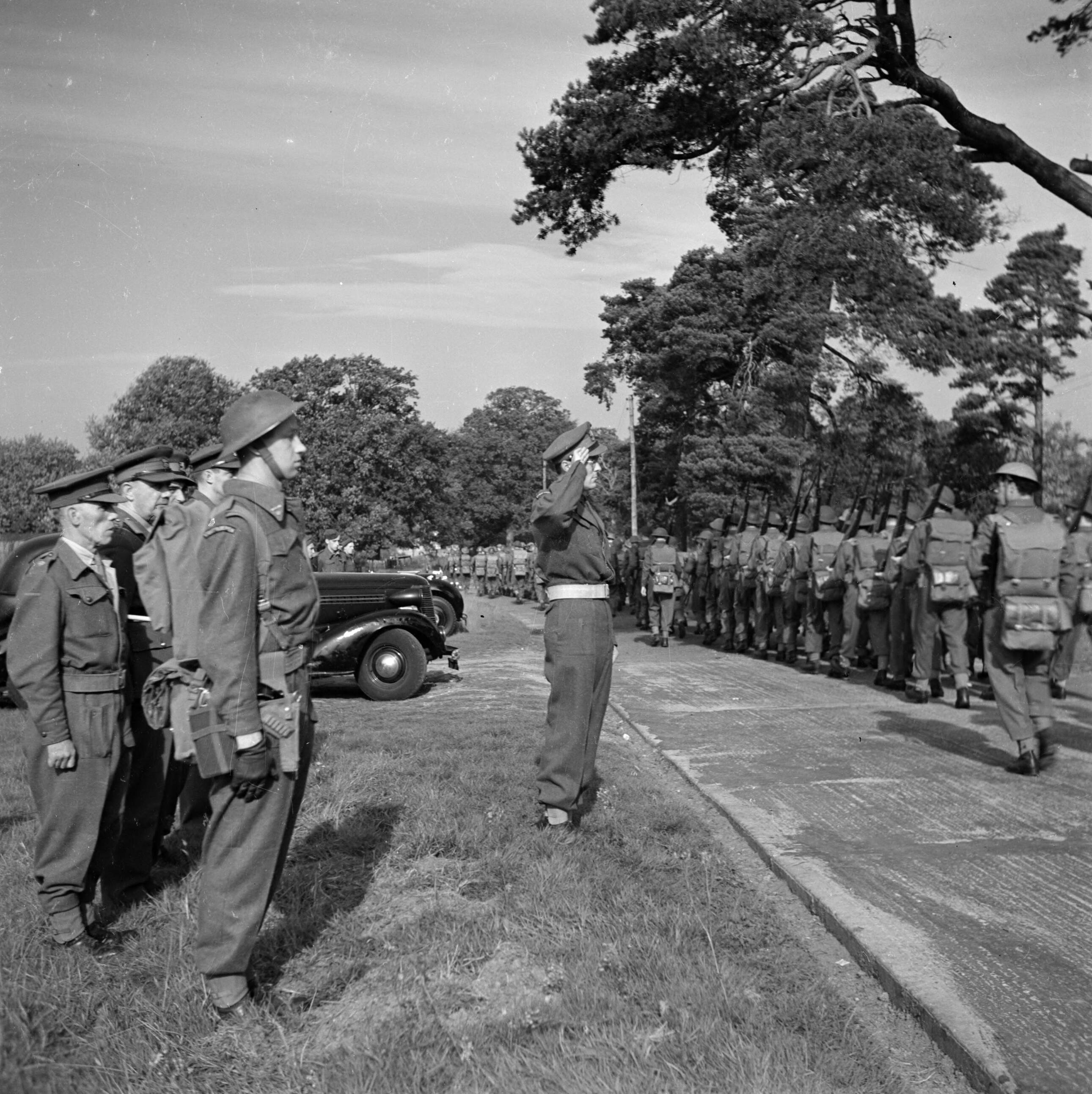 Militairen marcheren aan prins Bernhard voorbij