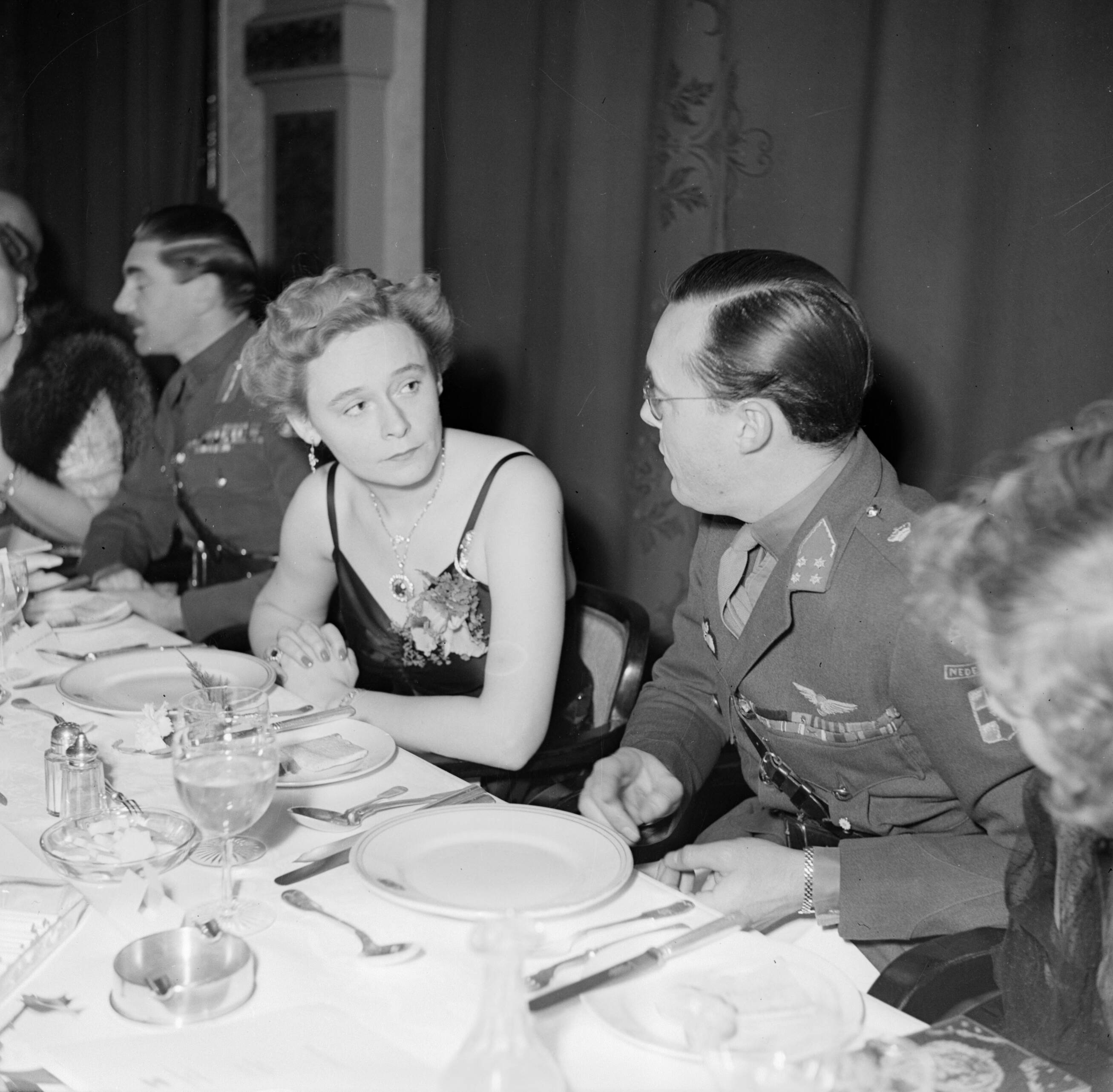 Prins Bernhard, mevrouw Simonds en generaal Simonds aan de dinertafel