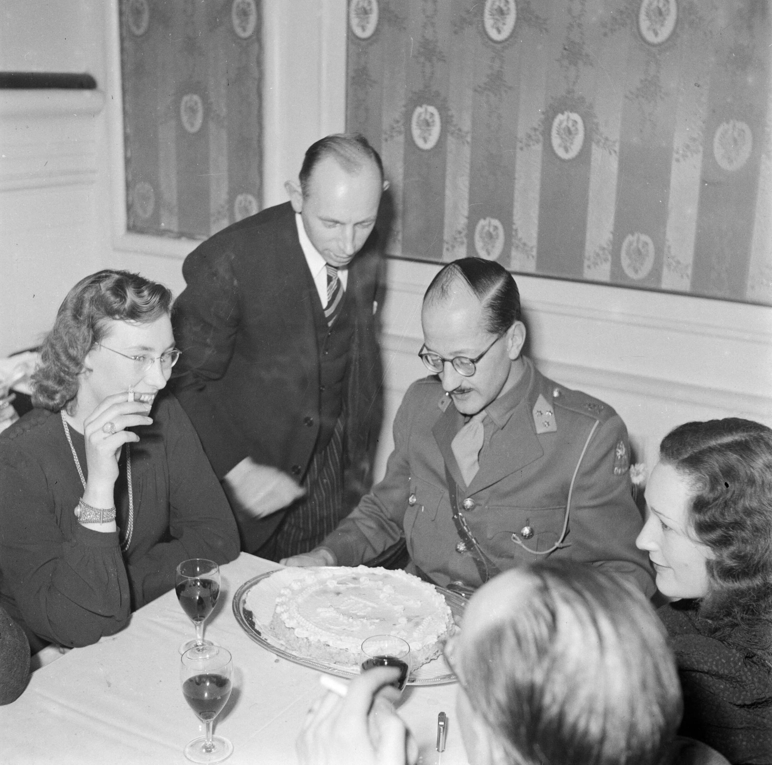 Kapitein Gerrie van Maasdijk, lid van de staf van prins Bernhard, krijgt een taart aangeboden op de taart staat het getal 100