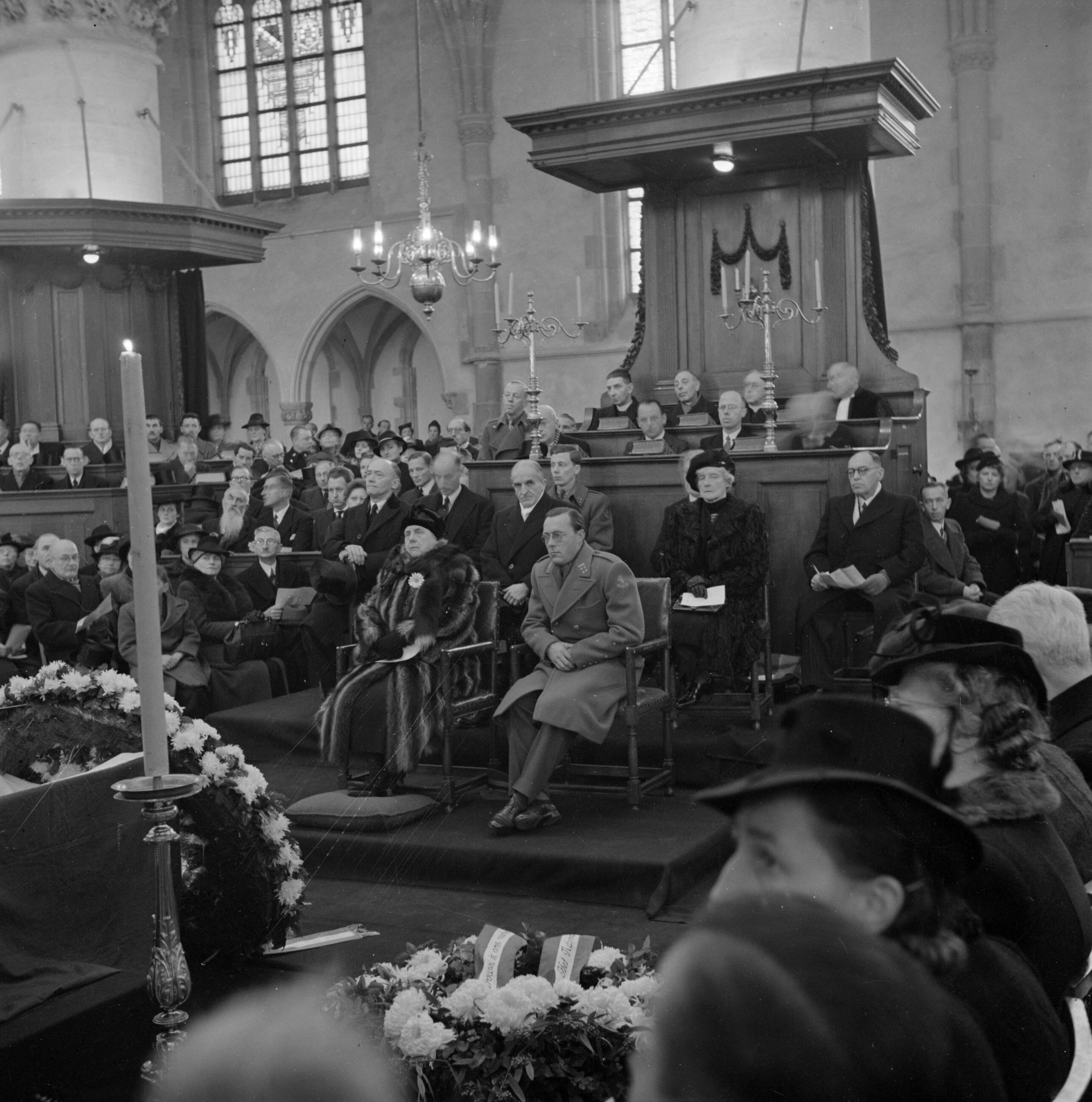 Herdenkingsbijeenkomst in de St. Bavokerk in Haarlem voor de 422 gefusilleerden in de duinen bij Overveen in aanwezigheid van koningin Wilhelmina en prins Bernhard