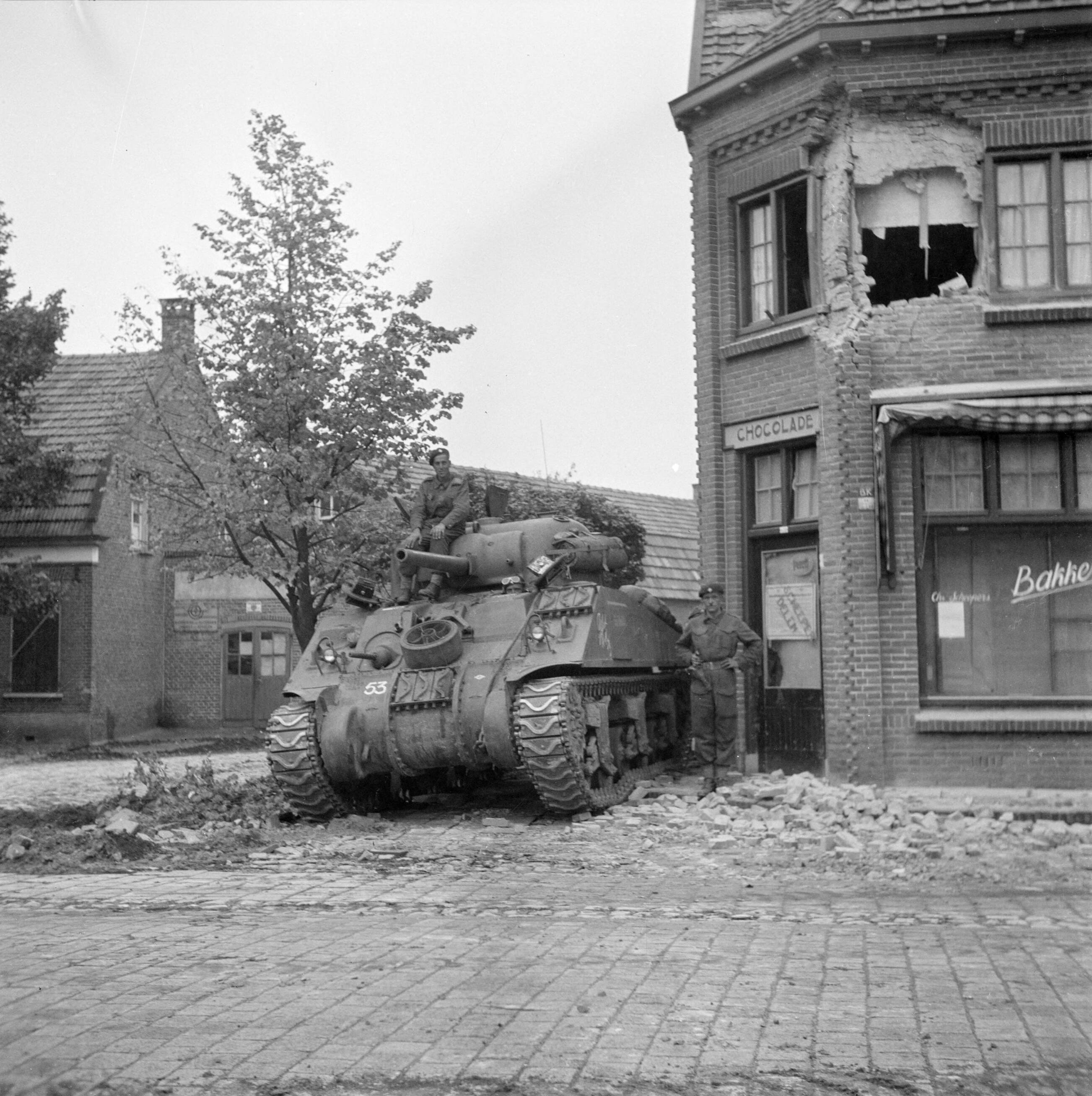 Tankeenheden van de Irish Guards nemen stelling op een kruising in Aalst