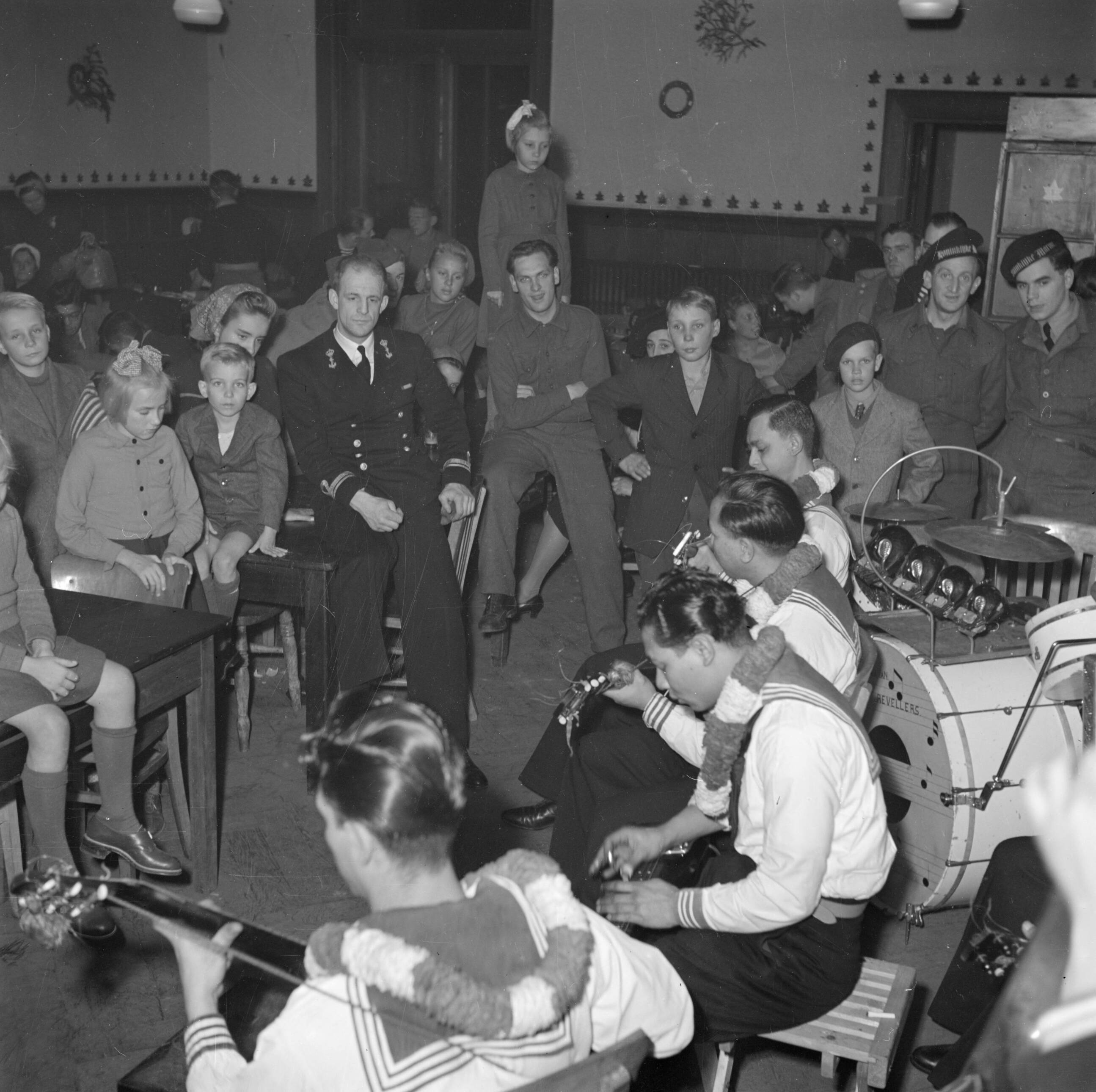 Marine-orkest bestaande uit voornamelijk Indische muzikanten speelt voor kinderen