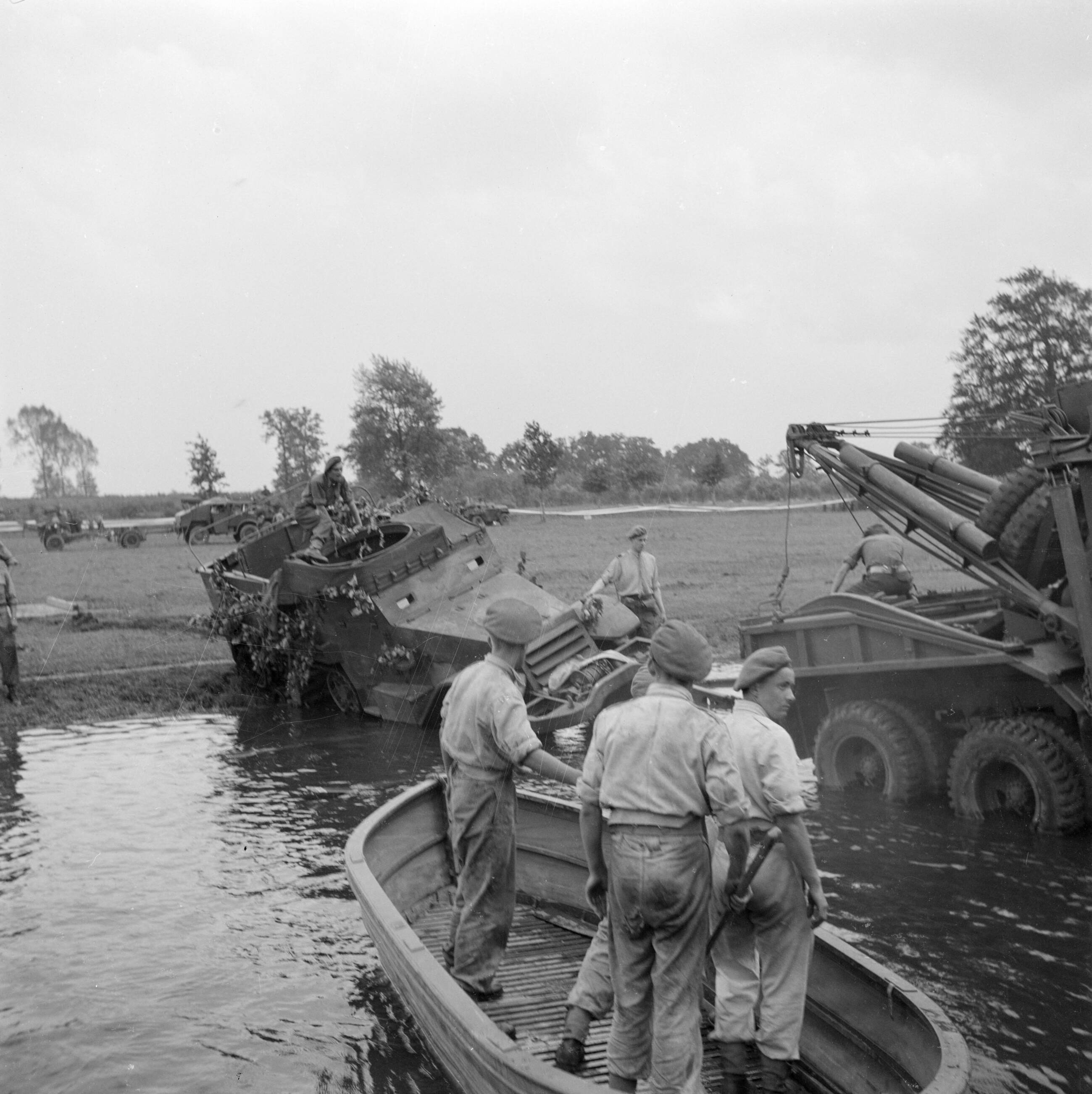 Een militaire oefening. Een rivier moet worden overgestoken. Een Half-track is vastgelopen in de rivier?