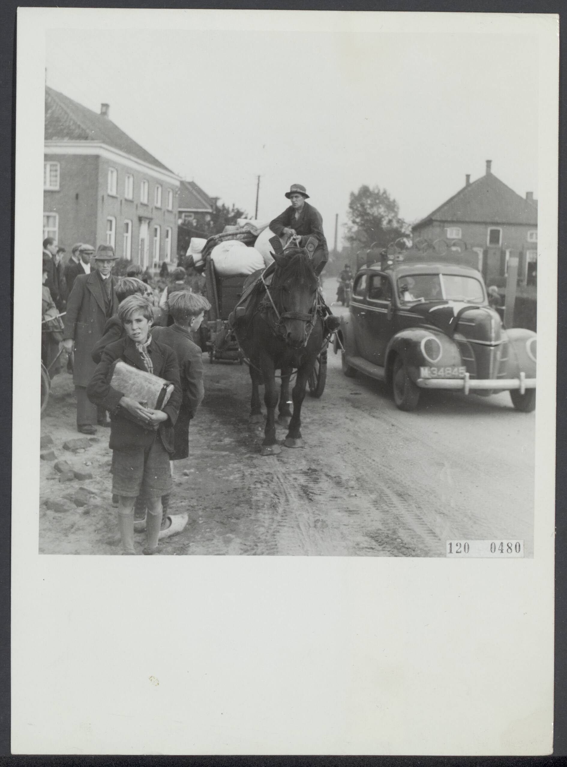 Vluchtelingen uit Nijmegen wachten op transport op een weg bij Nijmegen