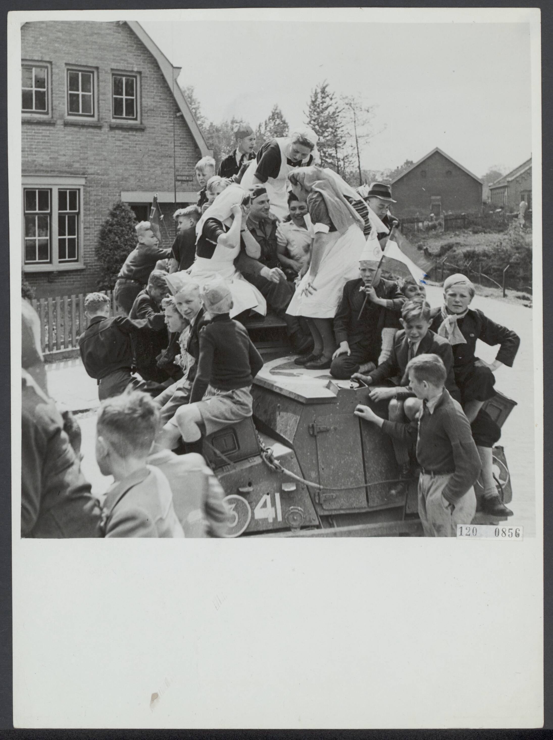 Bevrijding West-Nederland. Kinderen en verpleegsters beklimmen een Canadese pantserwagen
