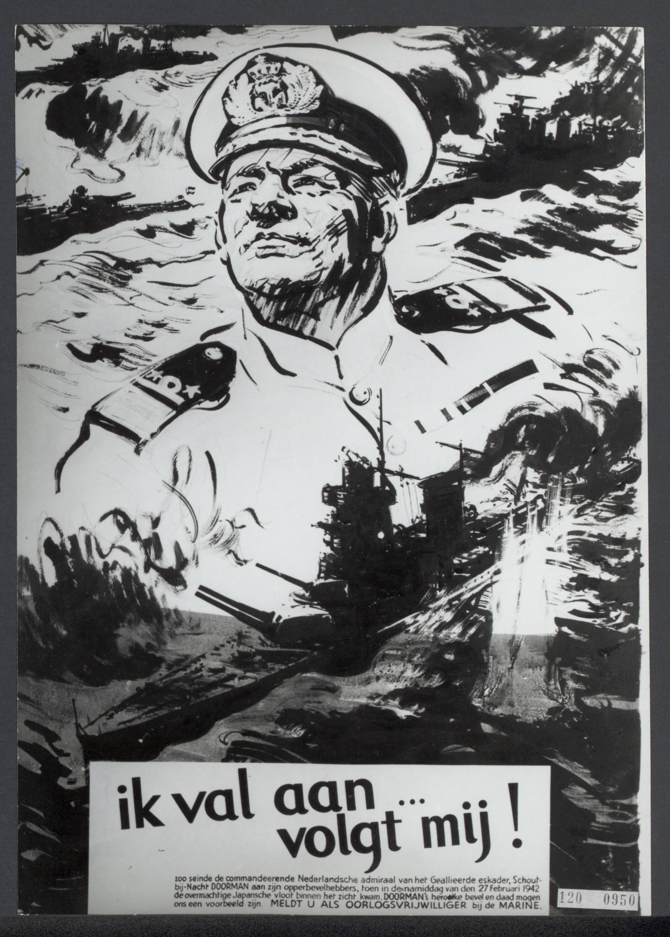 Affiche voor de werving van oorlogsvrijwilligers voor de marine. Afbeelding van Karel Doorman "Ik val aan...volgt mij!"