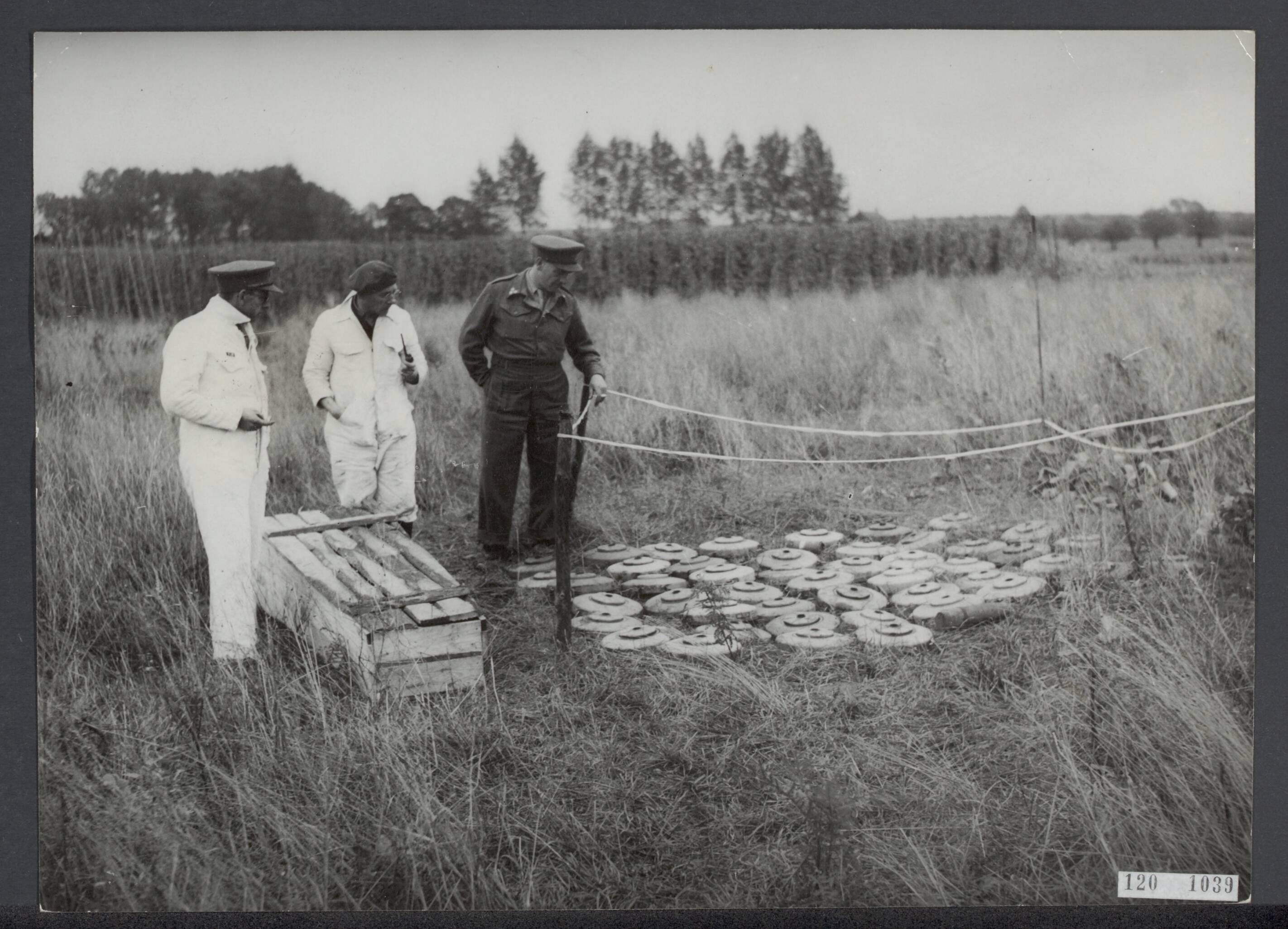 Kamp Amersfoort. Opgravingen, identificatie en berging. Landmijnen, opgegraven in één dag tijdens het zoeken naar begraven slachtoffers, tonen het gevaar van het werk. Aangezien machinaal gezaagd hout niet beschikbaar is, maakt men voor het maken van doodskisten gebruik van planken met de hand gezaagd van dennenbomen. Leden van het Medical Corps dragen witte jassen