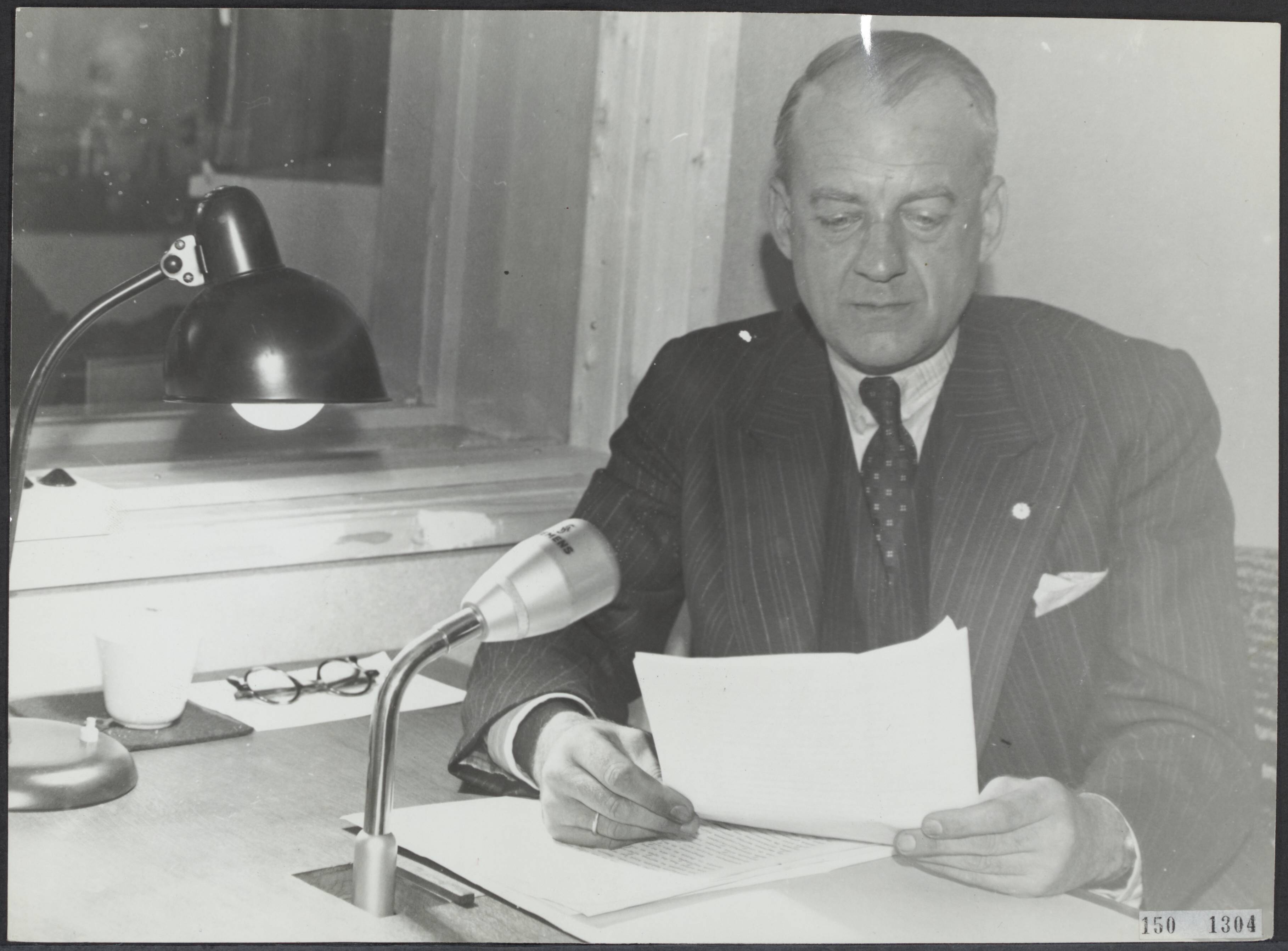 Mr. J. Meynen minister van Oorlog voor de radiomicrofoon