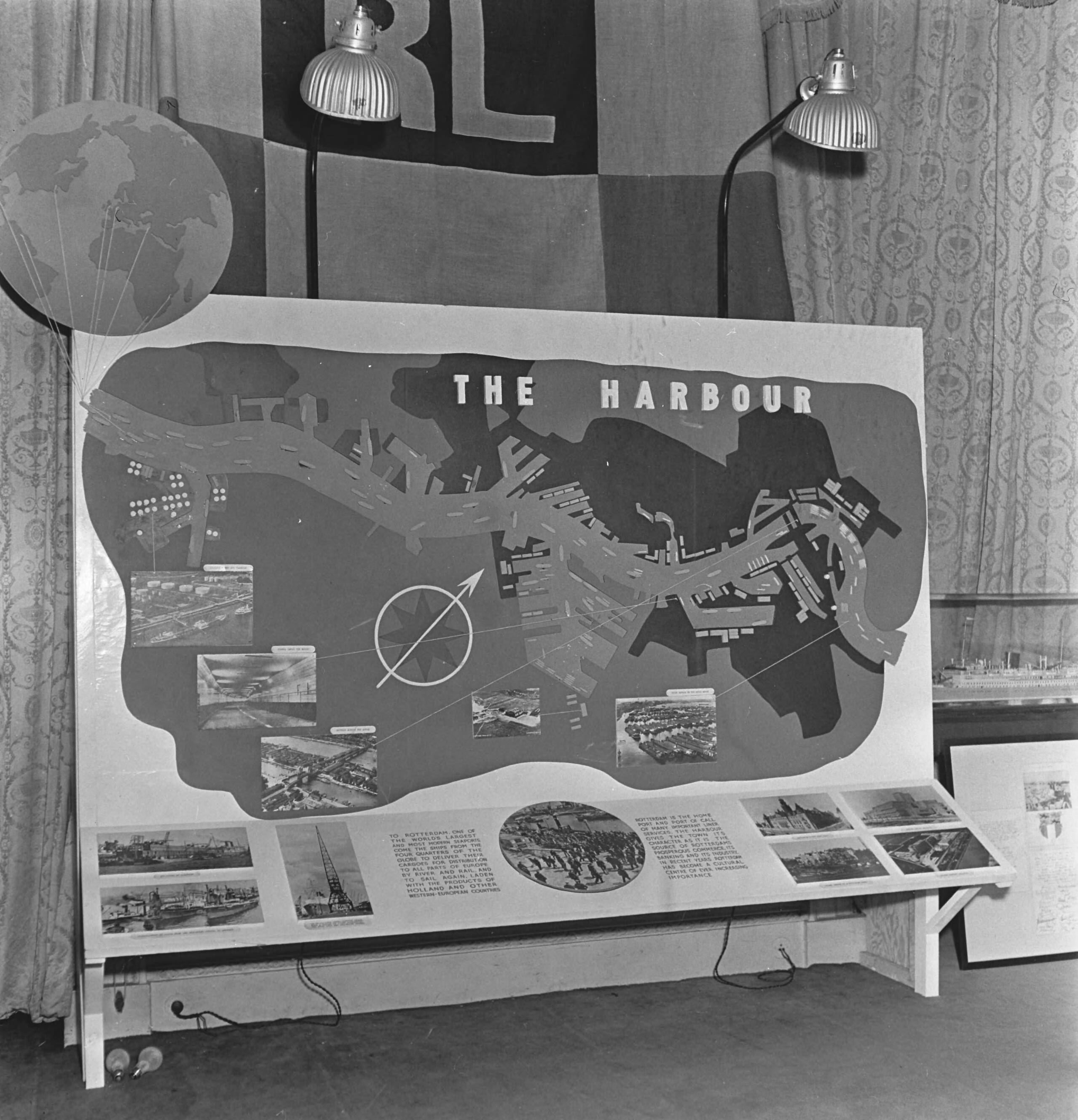 Opening Rotterdam-tentoonstelling ter herdenking van het bombardement in mei 1940 in het Netherlands House te Londen. Overzicht van de Rotterdamse haven