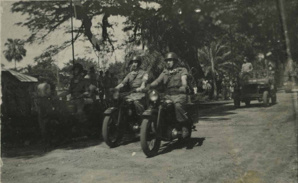 Bemande jeep bij een parade van het Regiment Stoottroepen in Nederlands-Indië.