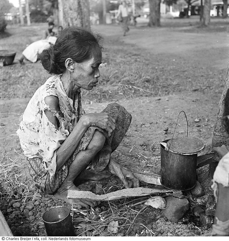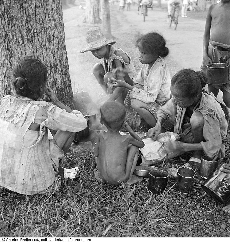 Een groep arme vrouwen en kinderen trachten in Jakarta op een schamel vuurtje iets eetbaars in blikjes klaar te maken, Indonesië (februari 1947)