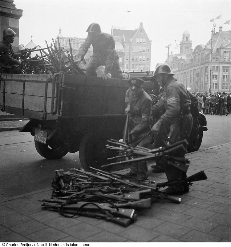Door politie in beslag genomen bijlen en zagen, die gebruikt werden voor illegale houtkap, Amsterdam (mei 1945)