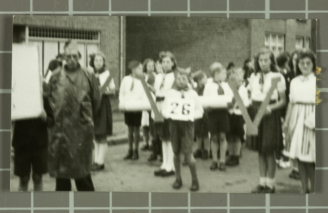 Bevrijdingsoptocht die in 1945 door de straten van Weert trok en waarin verschillende facetten van de oorlog werden uitgebeeld