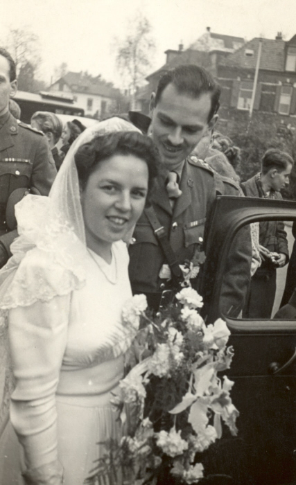1st Lt. Arthur Parks met zijn verloofde Guusje de Bruynkops en een onbekende jongen bij de Jeep van Parks.