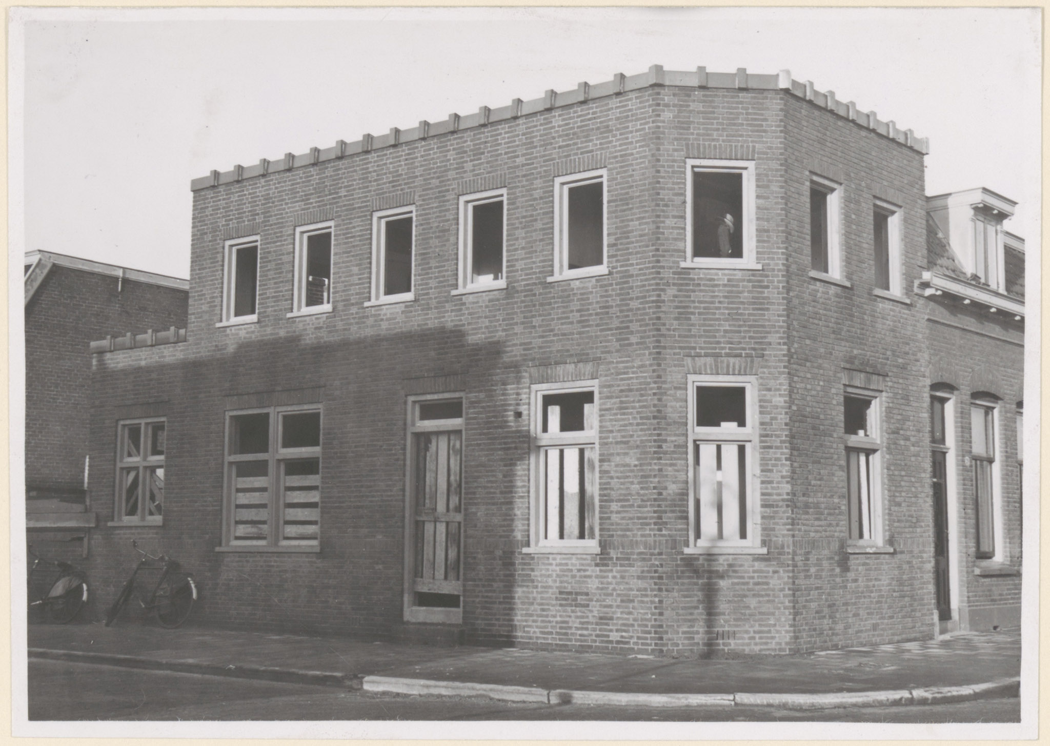 Herbouwde woning op de hoek van de Madeliefstraat en Tulpstraat na verwoesting door oorlogshandelingen.