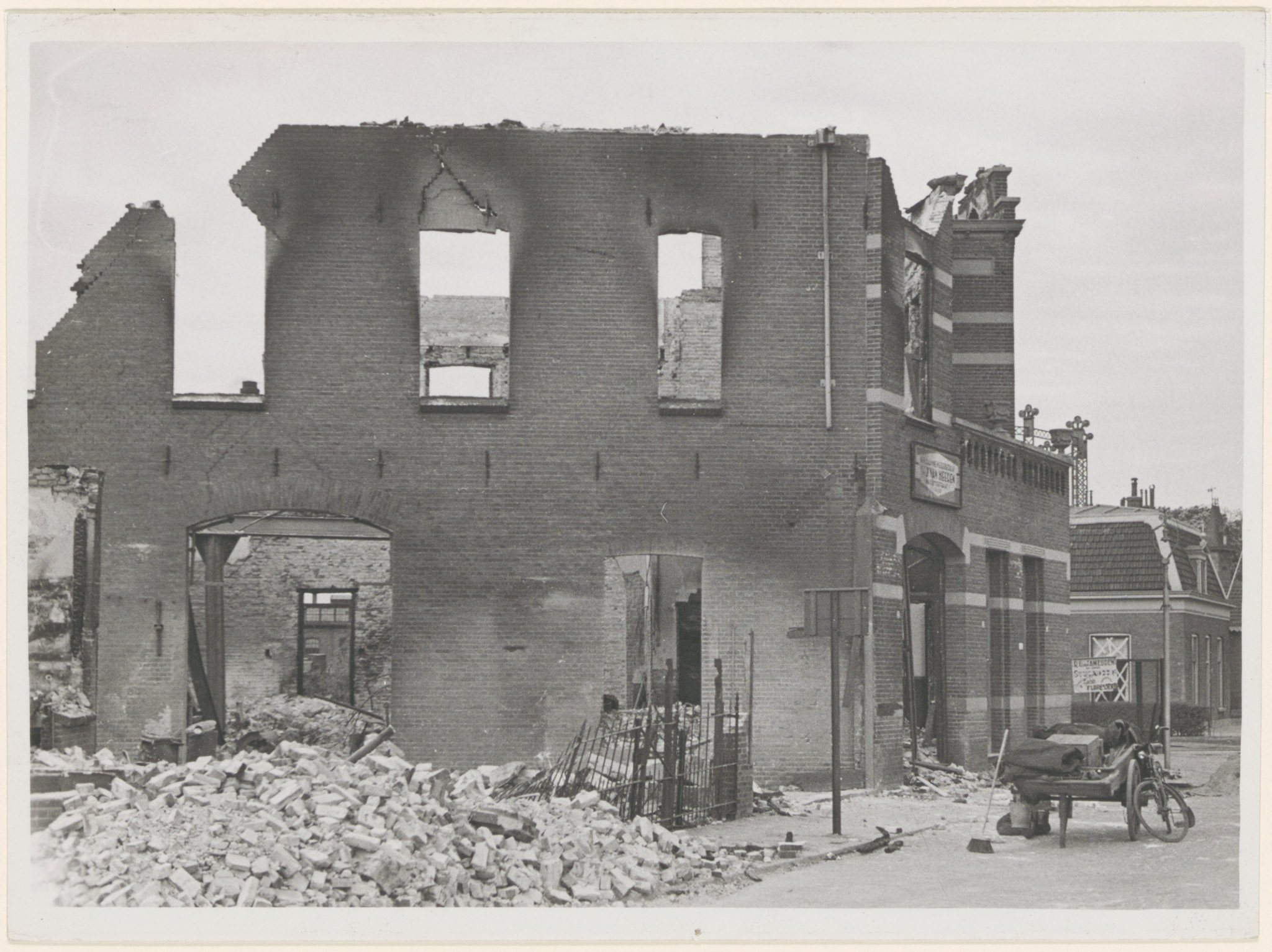 Oorlogsschade bij de spoorwegovergang Dubbeldamseweg. Rechts de gashouder aan de Markettenweg.