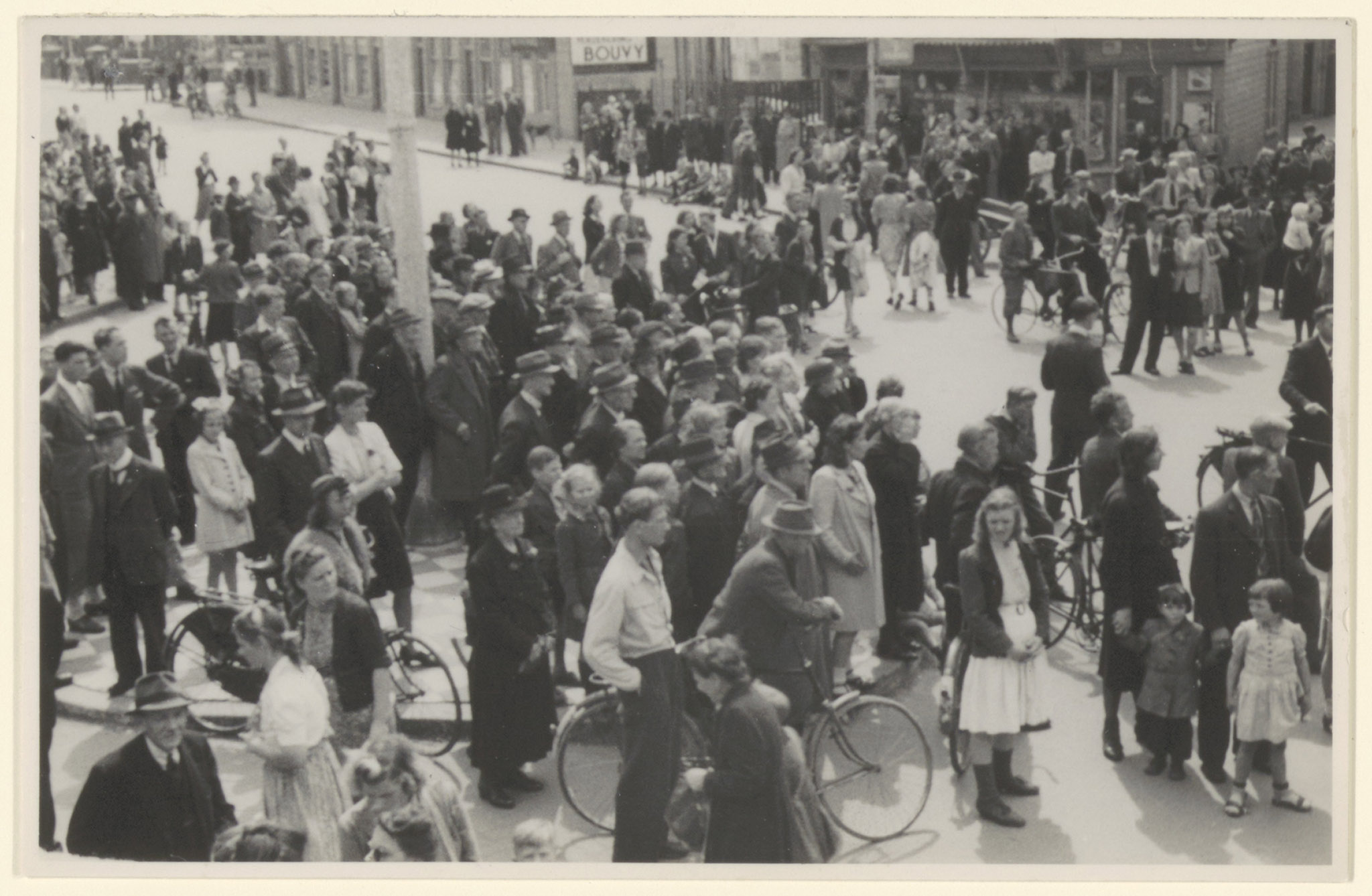 Een mensenmenigte op het Bagijnhof voor de spaarbank bij de bevrijding in mei 1945.