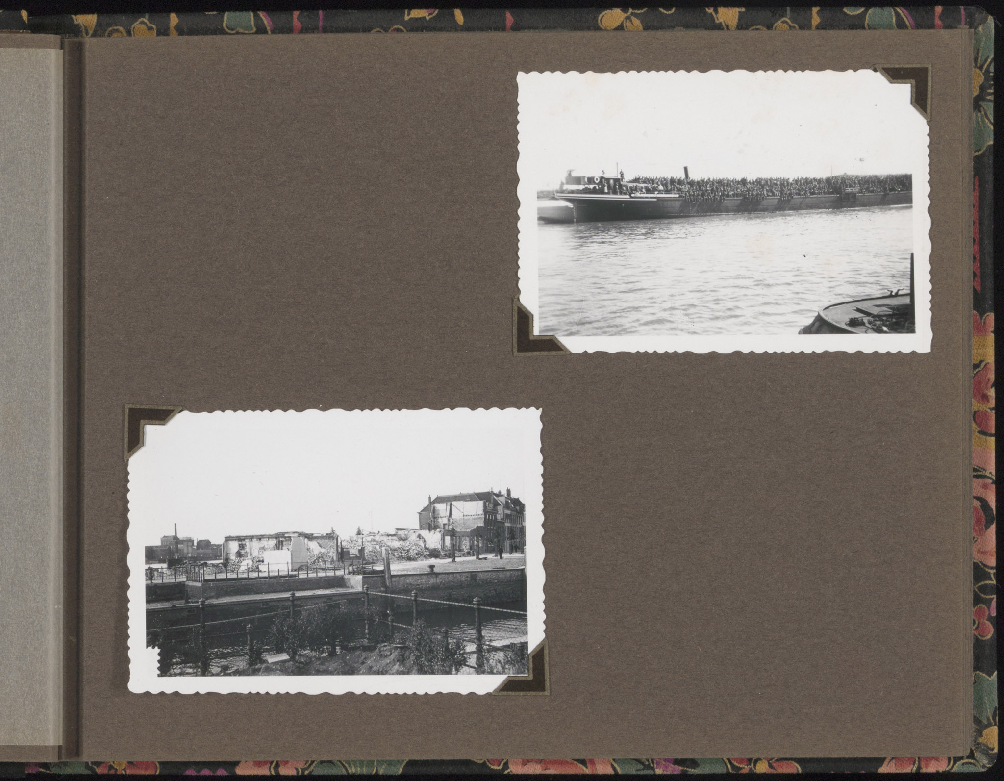 Boven: Belgische en Franse krijgsgevangenen passeren Dordrecht over de Oude Maas op weg naar Duitsland. Onder: Tijdens de oorlogsdagen van mei 1940 aangerichte schade aan huizen aan de Binnen Kalkhaven bij de Draaibrug.