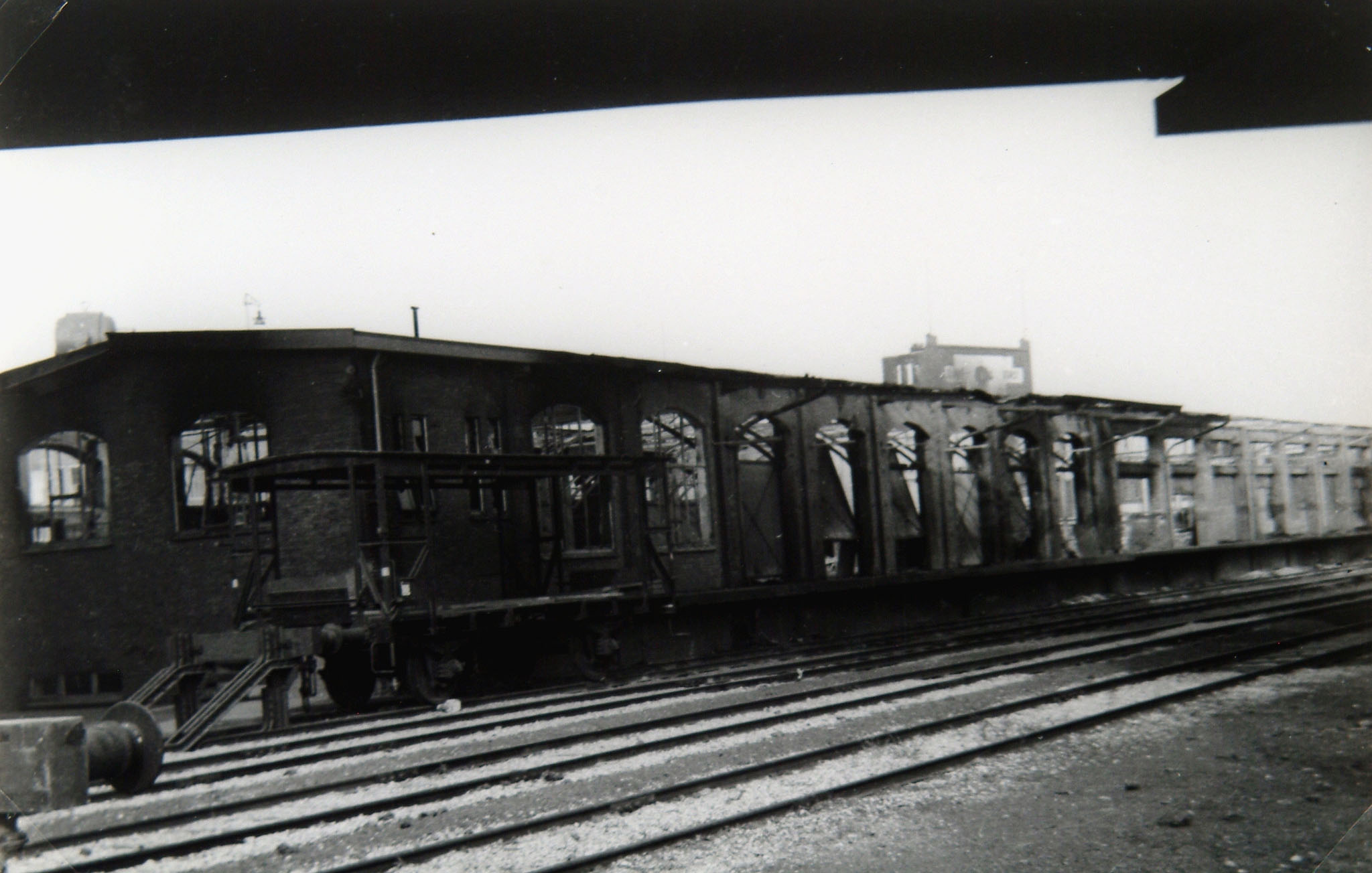 Door het bombardement in mei 1940 beschadigde goederenloods aan de 's-Gravendeelsedijk 8.
