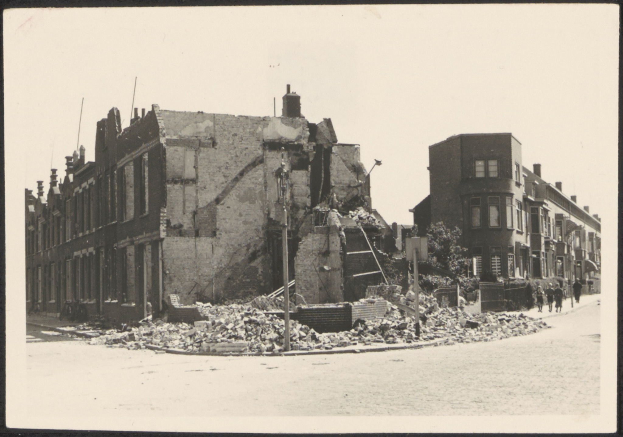 Door oorlogsgeweld vernielde huizen op de hoek van de Transvaalstraat en de Christiaan de Wetstraat (links).