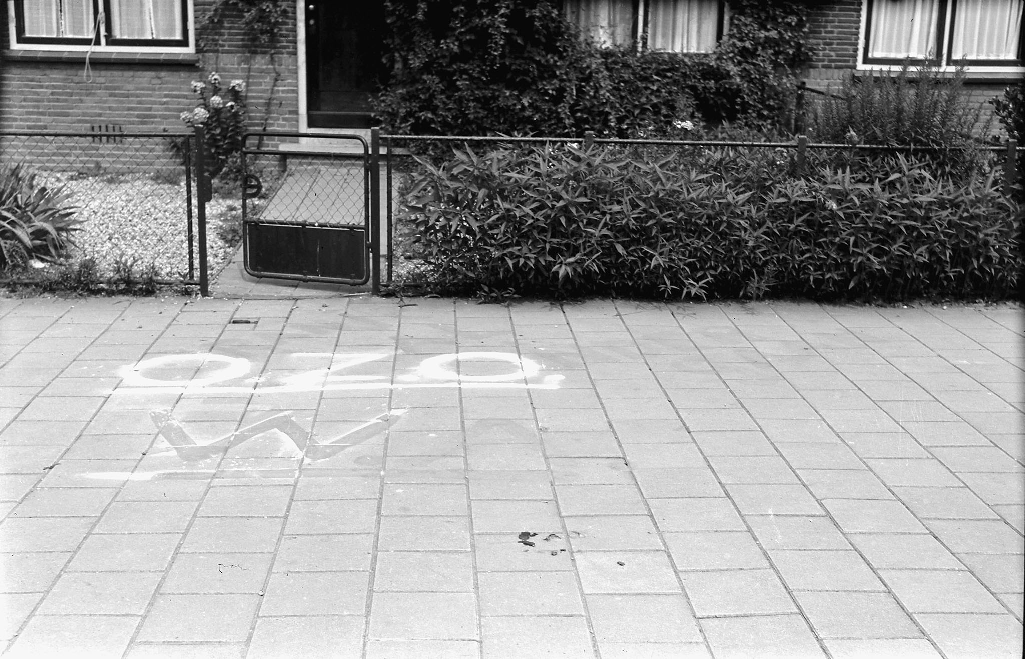 Op het trottoir van Reeweg Oost bij de hoek van de Ceramstraat staat OZO gekalkt, een afkorting van ...