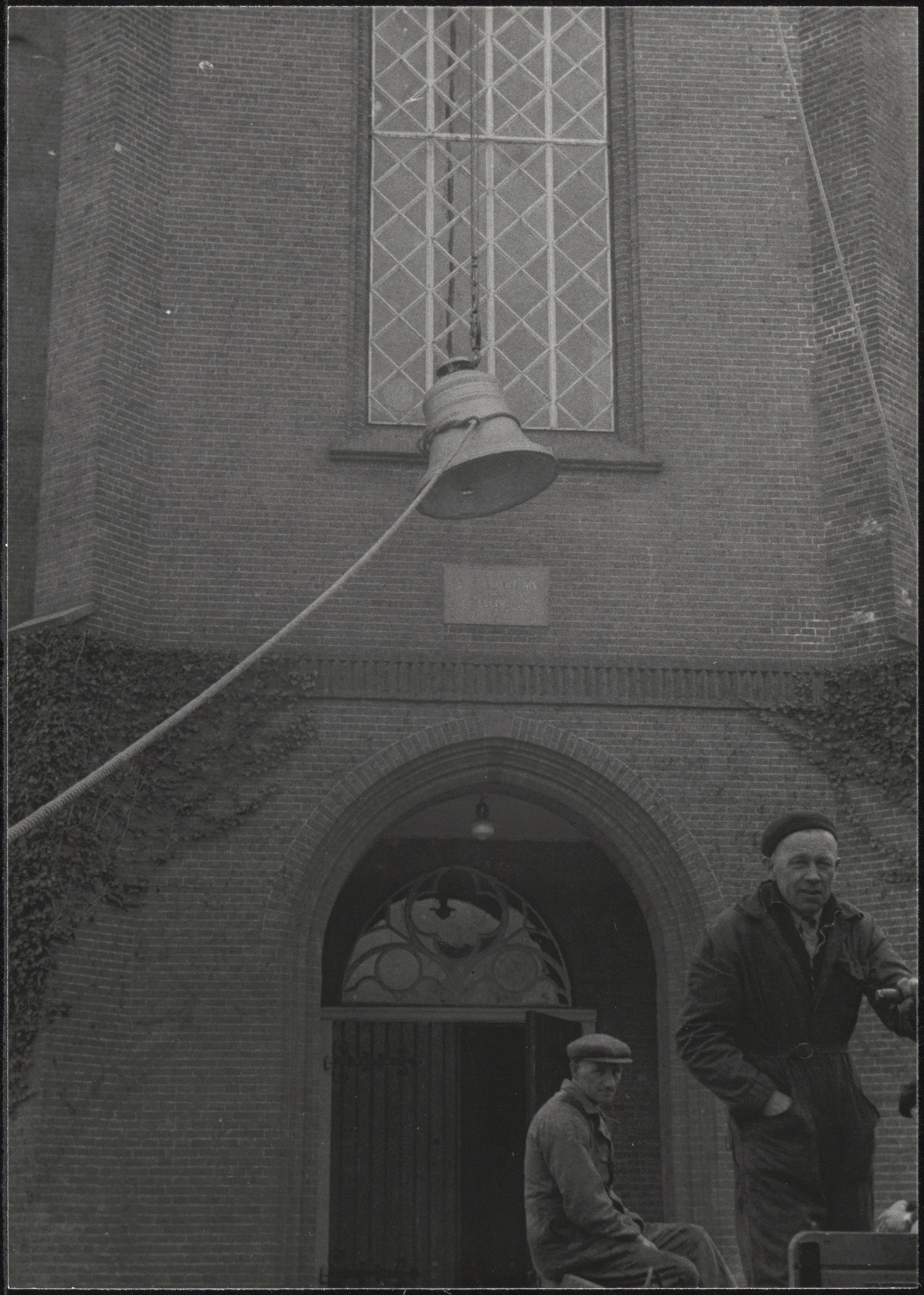 Verwijdering van de klok uit de Grote Kerk aan het Cortgene in Alblasserdam om omgesmolten te worden voor oorlogsdoeleinden.