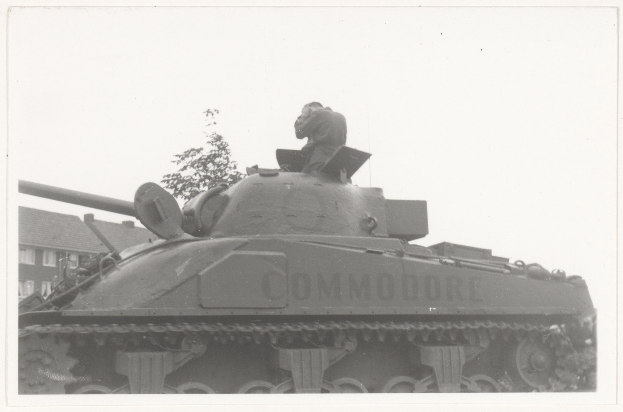 Een tank in de Van Baerlestraat tijdens de bevrijding van de Duitse bezetting in mei 1945.