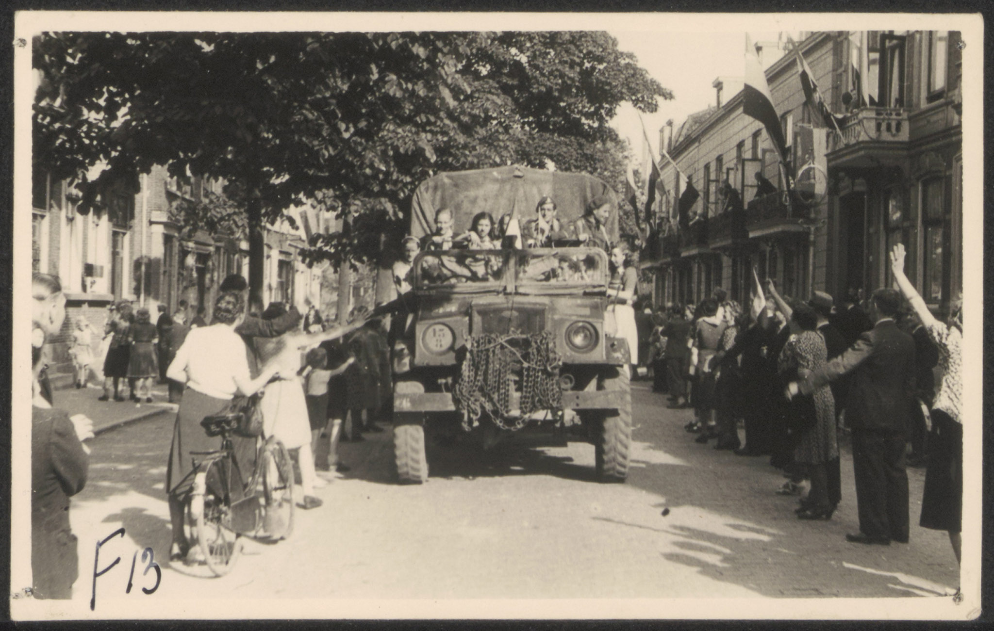 Bevrijding van de Tweede Wereldoorlog met Canadese militairen op de Albert Cuypsingel; ze rijden ric...