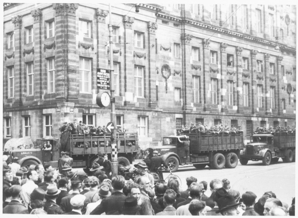 Amsterdam.Achter het paleis op de Dam. Bezoeker afvoeren van Duitsers uit de Groote Club???