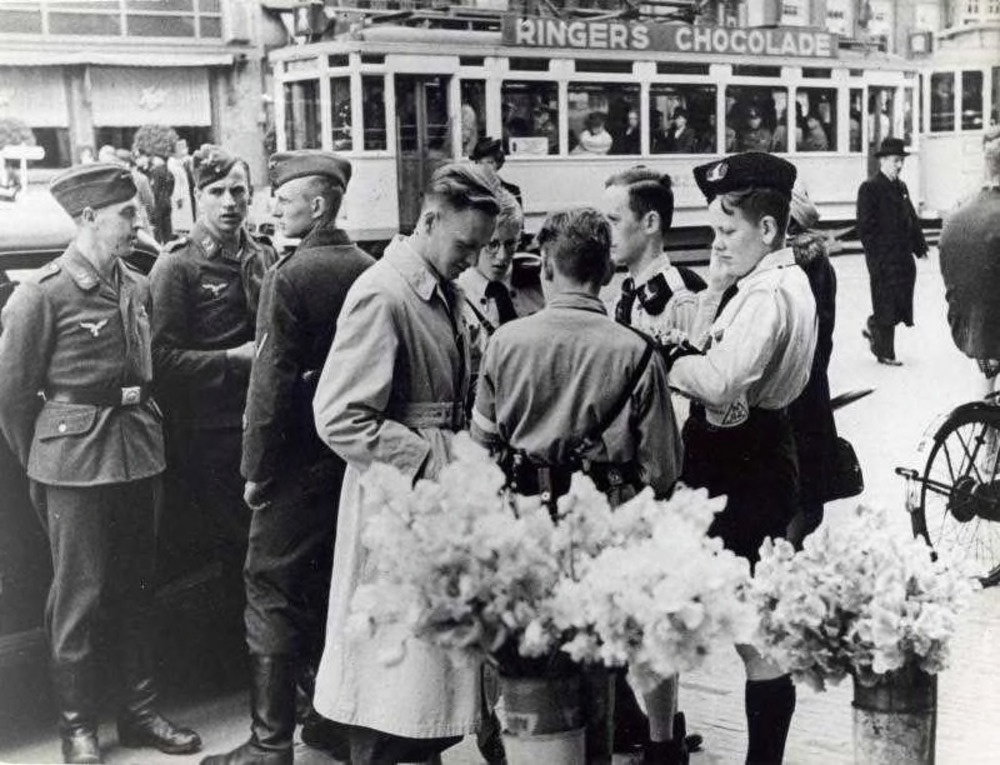 Foto: ''Belangstelling voor de Jeugdstorm.'' Nederlandse kinderen staan te kijken naar leden van de NJS. De jongerenorganisatie van de NSB, de Nationale Jeugdstorm (NJS), werd op 1 mei 1934 opgericht. Het lidmaatschap was op basis van vrijwilligheid. 'Arische' jongens en meisjes tussen de 10 en 18 jaar konden toetreden. Hoewel de Jeugdstorm de schijn probeerde op te houden een niet-politieke groepering te zijn, waren de ideeën grotendeels gebaseerd op de NSB-ideologie. Tijdens de bezetting streefden de Duitsers ernaar de NJS op te laten gaan in de Hitler-Jugend. Maar Mussert en 'hoofdstormer' C. van Geelkerken slaagden erin het nationale karakter van de jeugdorganisatie te bewaren. Op haar hoogtepunt telde de Jeugdstorm 16.000 leden.