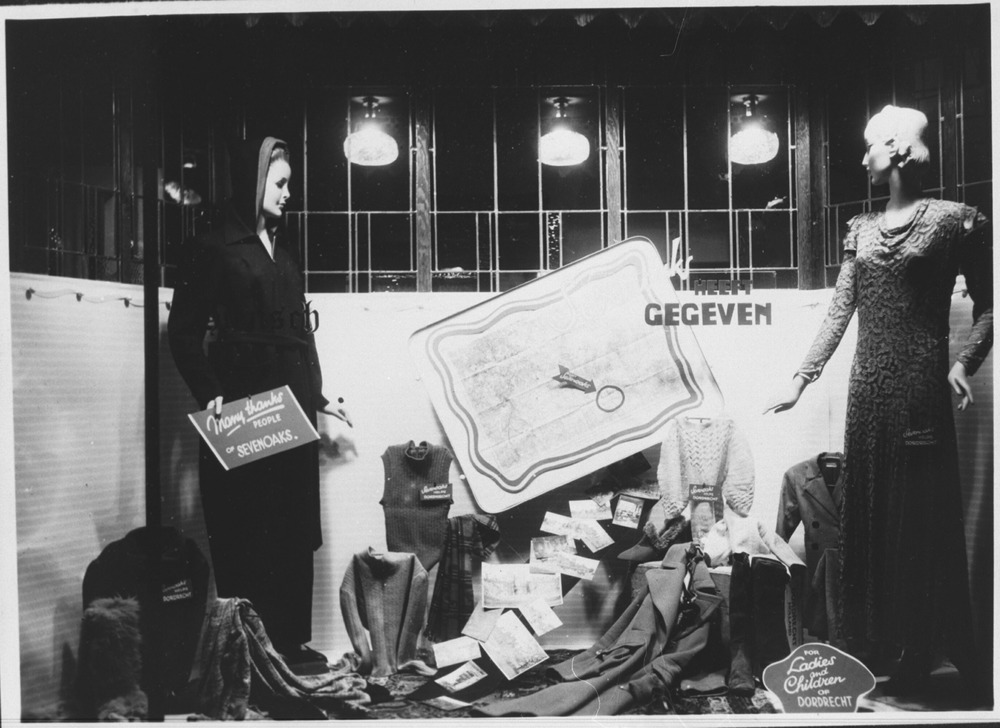 's-Gravenhage. Schoenenetalage bij de fa. Velleman.Hulpgoederen uit Denemarken, Engeland en Canada.HARK.