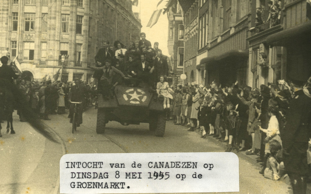 Intocht Canadezen, mei 1945. Afgebeelde tank is een Sherman firefly