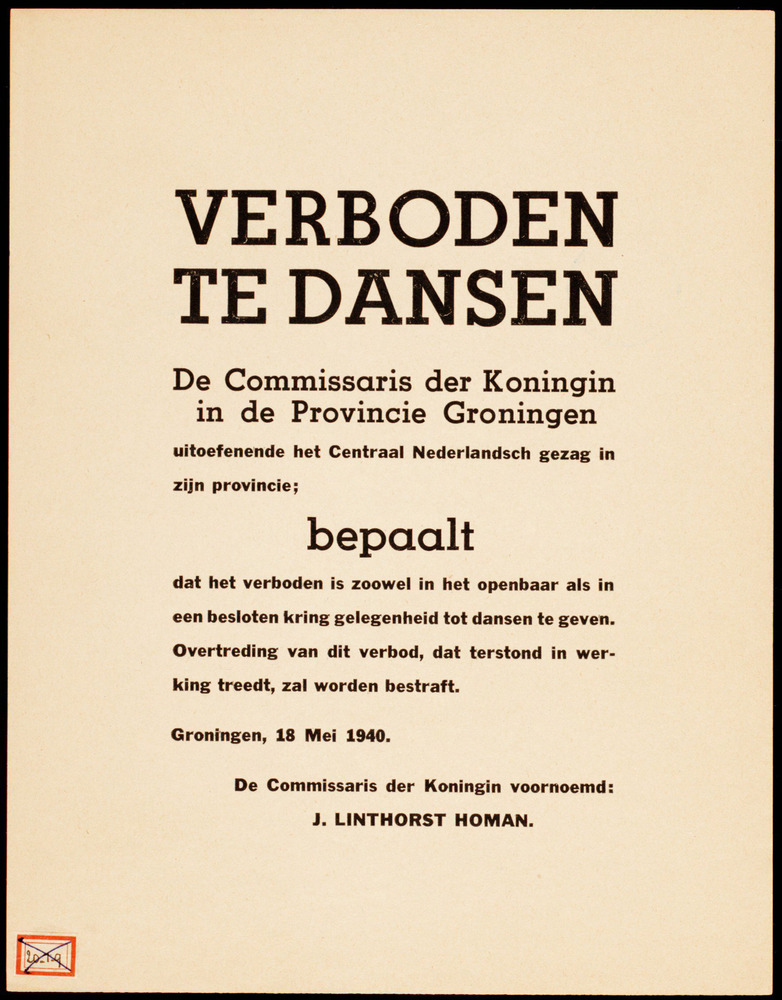 Openbaar Dansvermaak is tot nader order verboden, niet openbaar dansvermaak georganiseerd door officiële instellingen oo...