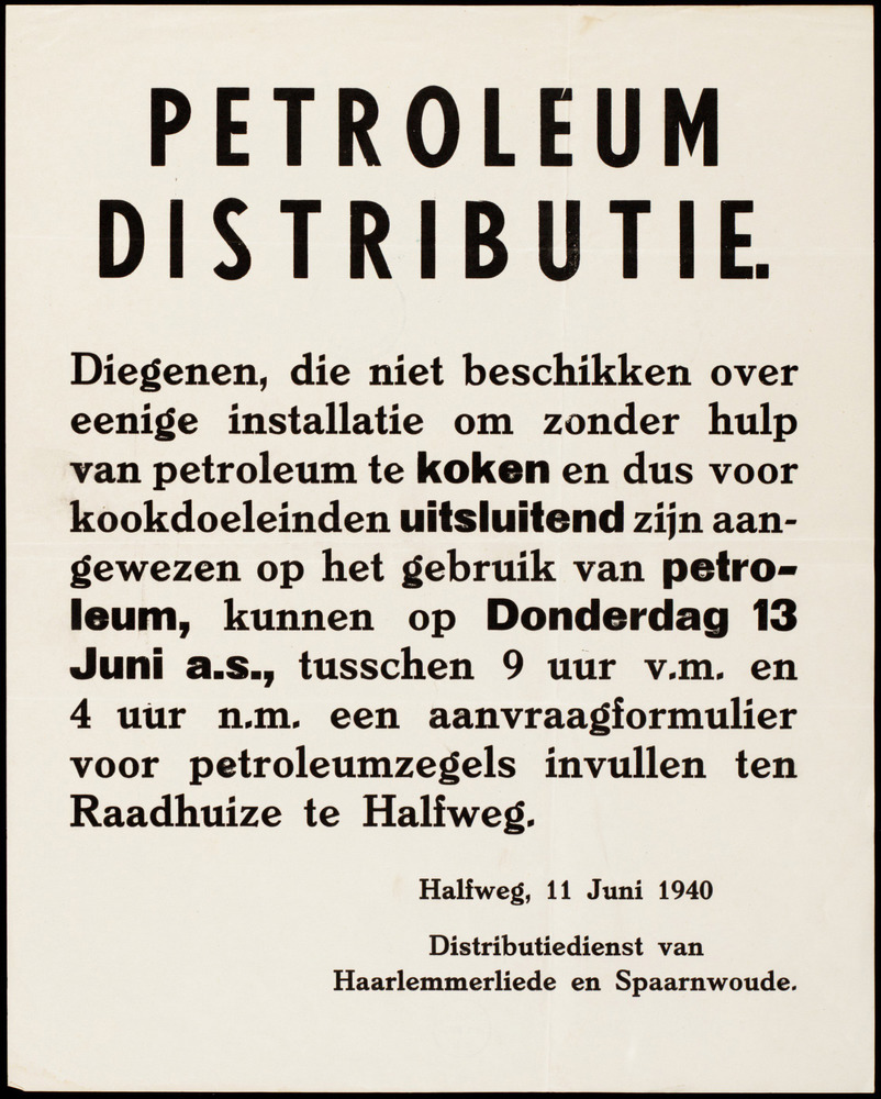Petroleumdistributie. 1. m.i.v. 17 juni a.s. verkoop en aflevering van petroleum alleen toegestaan voor huishoudelijke kookdoeleinden. 2. Overheidsbedrijven etc. kunnen bestelbonnen krijgen. 3. Aanvragen voor land en tuinbouw en veeteelt indienen bij de p
