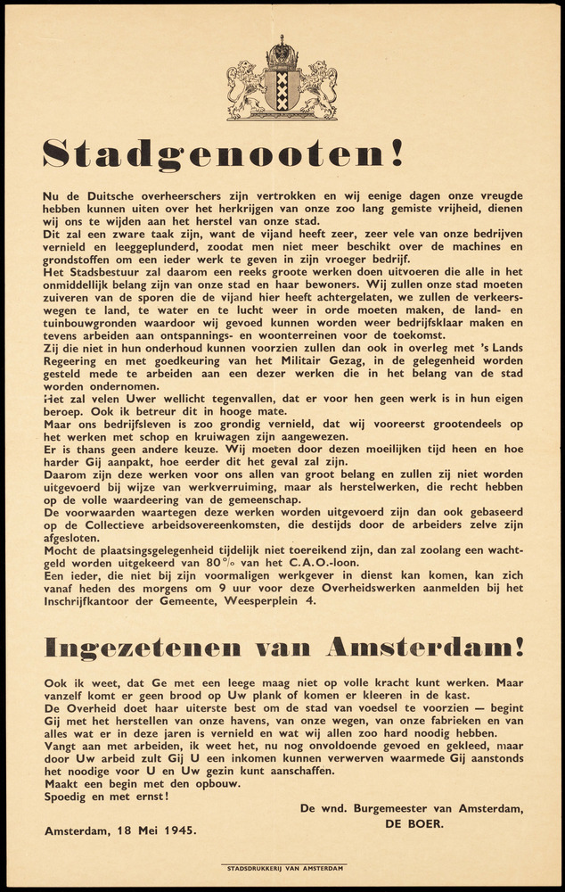 Stadgenooten ! Nu de Duitsche overheerschers zijn vertrokken [===] dienen wij ons te wijden aan het herstel van onze stad. [===] Maakt een begin met den opbouw. Spoedig en met ernst ! Amsterdam, 18 Mei 1945. De wnd. Burgemeester van Amsterdam, De Boer.