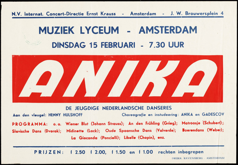 Harmonie Leeuwarden. Woensdag 3 november - 7.30 uur. Anika, de jeugdige Nederlandse danseres. Aan de vleugel: Henny Hulshoff. Programma o.a. Wiener Blut - An den Frühling - Matroosje - Slavisel Dans - Micinette - (...)