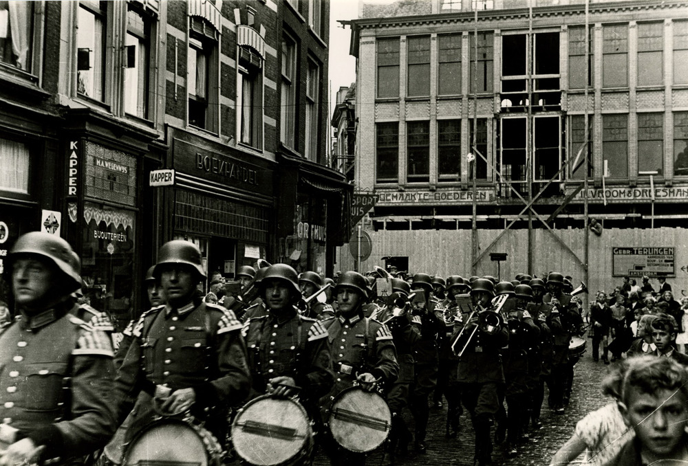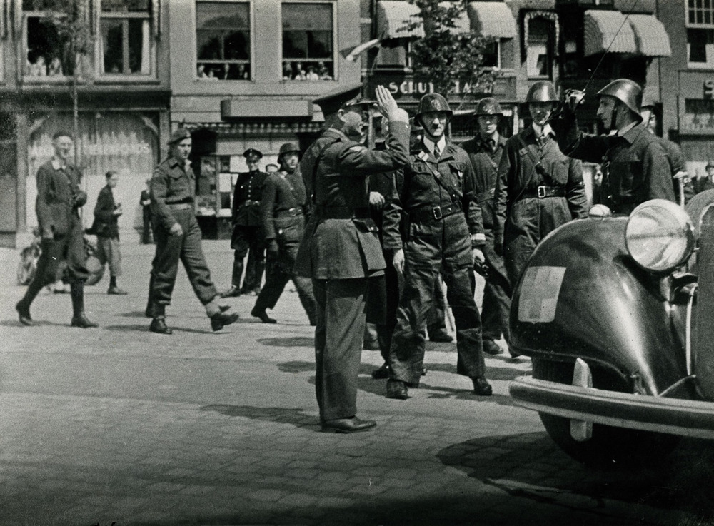 Na de afscheidsmars door geheel Gouda opmars van de 1800 mannen van de B.S. op de Markt, op foto (rug) de plaatselijke Commandant B.S. in Schoonhoven en D.C. Binnenlandse Strijdkrachten (B.T.).