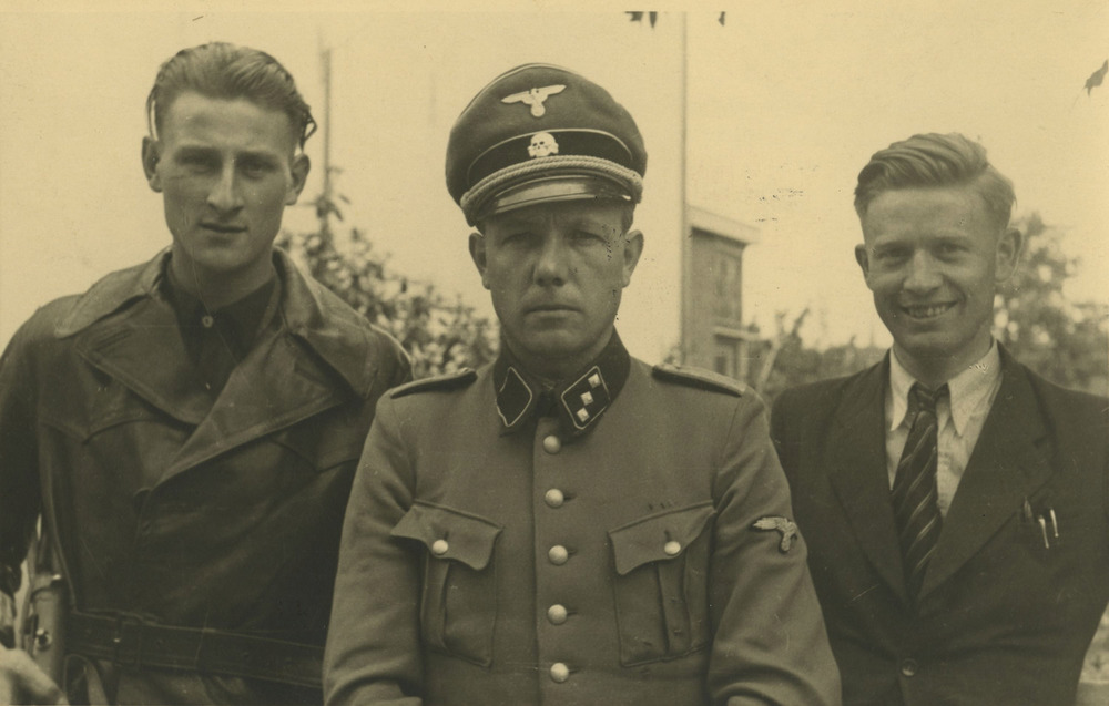 ' Berg (tussen 2 jongens van de ondergrondse - rechts Gerrit Kleinveld). Amersfoortse kampbeul nummer 4. '