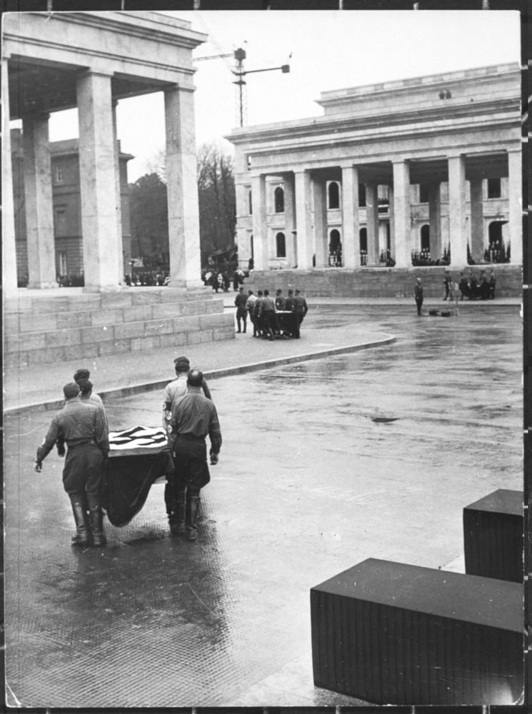 Abschluss der Feierlichkeiten zum 9. November in München. Die 16 Toten des Marsches auf die Feldherrnhalle vor 12 Jahren sind am 9. Nov. 35 in den neu erbauten Ehrentempeln auf dem Königsplatz feierlich beigesetzt worden. Sie wurden von der Feldherrnhalle, wo sie aufgebahrt waren, auf Laffetten zum Königsplatz überführt. Die Särge werden von der Ehrentempeln auf dem Königsplatz aufgestellt.