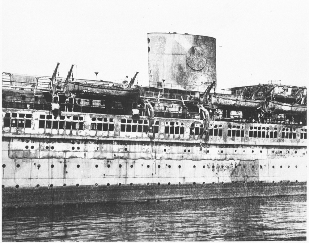 Allied bombers blast Hamburg. The Nazi liner Robert Leyis listing at its Hamburg wharf after being gutted by fire.