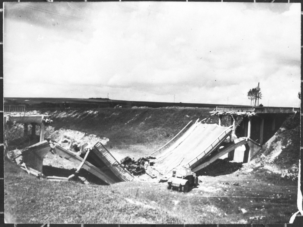 Visual bridges blown up by poles. A car being ferried over the Vistula by Germans after the retreating Poles and blown up all the bridges.