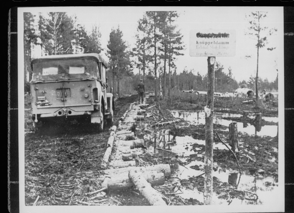 Der endlose Knüppeldamm. Selbst in den sowjetischen Dörfern sind die Strassen derart verwahrlost, dass ohne Knüppeldamm ein Vorwärtskommen unmöglich wäre.