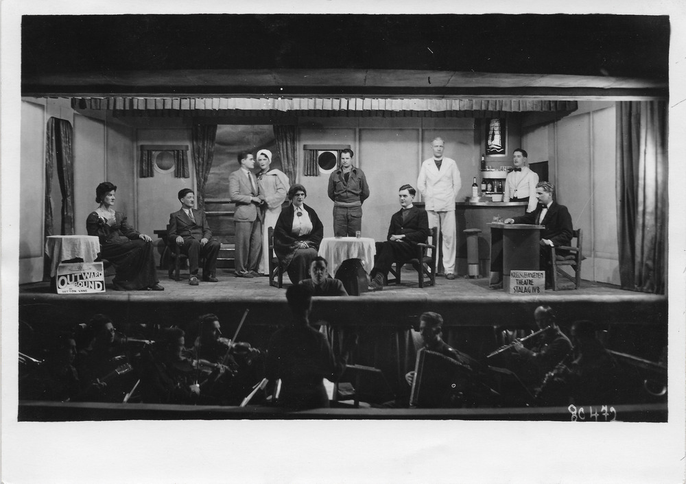 ( foto nr., 80850 ) Toneelspelers, Nederlanders? . Collectie foto's over het krijgsgevangenenkamp Stalag IV B, Mühlberg a/d Elbe. Het kamp werd opgericht eind 1939 en werd bevrijd op 23 april 1945. Er zaten ca. 10 nationaliteiten vast. In juni/ juli 1943 arriveerden er een groep van 2300 Nederlanders. De Nederlandse militairen waren in april opgeroepen zich te melden om opnieuw in krijgsgevangenschap te gaan. Dit was de aanleiding tot de April-Mei stakingen. Uiteindelijk werden ruim 8000 militairen weggevoerd naar Duitsland. Vanaf ca. 1940 bezat het kamp een fotoafdeling waar 3 Fransen werkten. Zij moesten gebeurtenissen , werkplaatsen en begrafenissen fotograferen. Voorjaar 1944 werden ook drie Nederlanders aangesteld op de fotoafdeling: D. van Maarseveen, J. W. Adam en C. van Weele. Voordat zij deze baan kregen werkten ze in de keuken. Zij fotografeerden ook illegaal in het kamp. Het is nu niet meer na te gaan welke foto door welke fotograaf is gemaakt. J.W. Adam ( 194 - 1997) nam een grote collectie afdrukken mee terug naar huis. Hij was geen fotograaf maar hoofd boekhouder. Ook beide andere fotografen namen negatieven en afdrukken mee terug. D. van Maarseveen fotografeerde ook de bevrijding en de ingewikkelde reis terug naar Nederland.