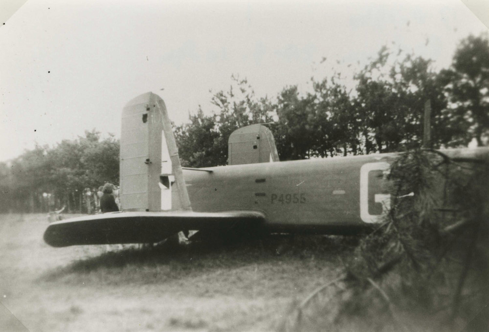 Foto van wrak Armstrong Withworth Whitley in weiland met bomen op de achtergrond. Tekst achterop; 'Whitley P4955. Rijsbergen 17-8-1940'. het gaat hier om Armstrong Witworth Whitley V P4955 ZA-G van 10 squadron. Het vliegtuig van om 2034 uur opgestegen van Leeming om de Zeiss fabrieken te Jena aan te vallen. Het vliegtuig zou boven jena door luchtafweergeschut getroffen zijn. De bemanning werd volledig krijgsgevangen genomen. Volgens Duitse radioberichten is het toestel echter neergekomen te Zevenbergen