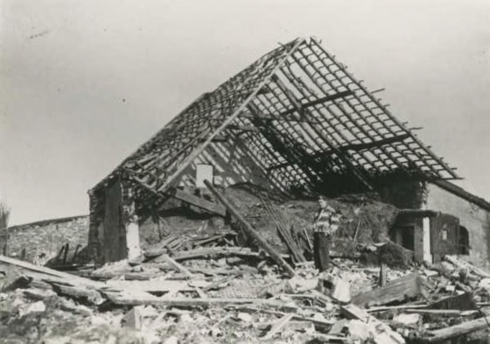 Foto van drie mannen voor een ruïne van boerderij te Groesbeek. (foto afkomstig van Luyben)