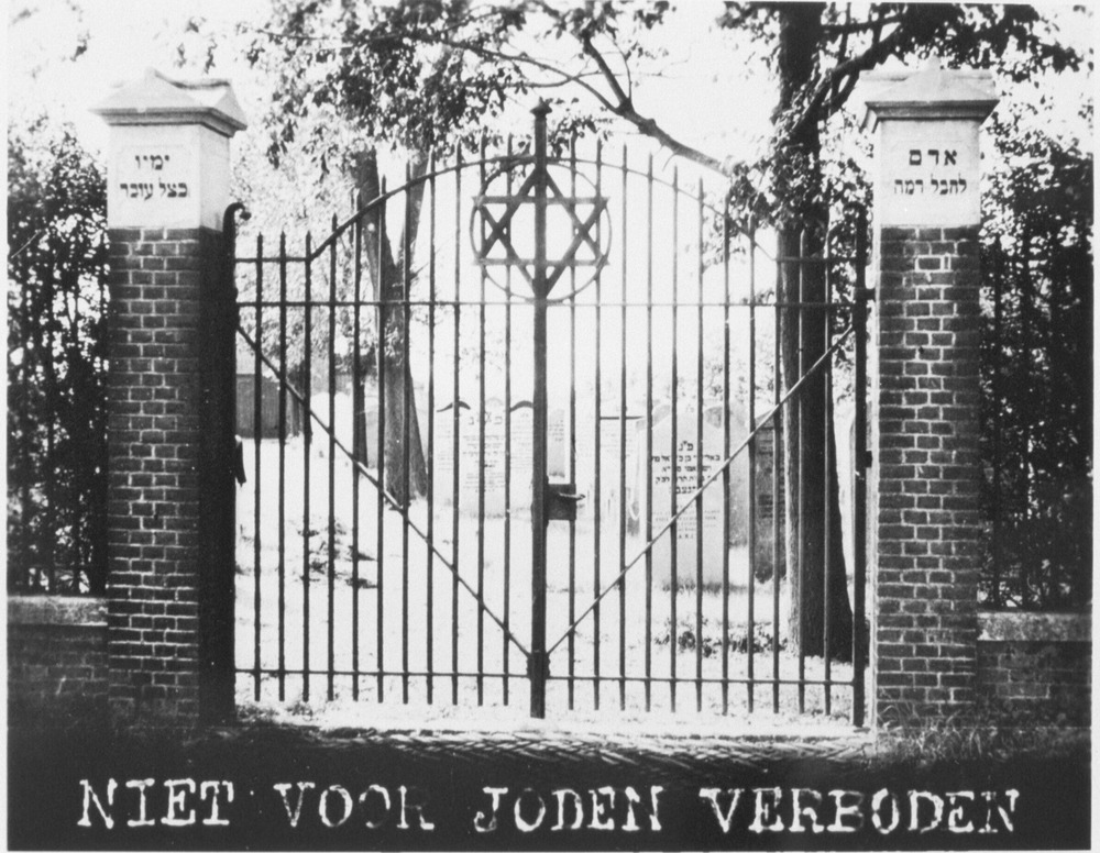 Foto van niet geïdentificeerd pand houten wand. Deur versierd met hakenkruisen, V-tekens, een afbeelding van een galg met gehangenen en de tekst 'Hier wohnt eine Jude'.