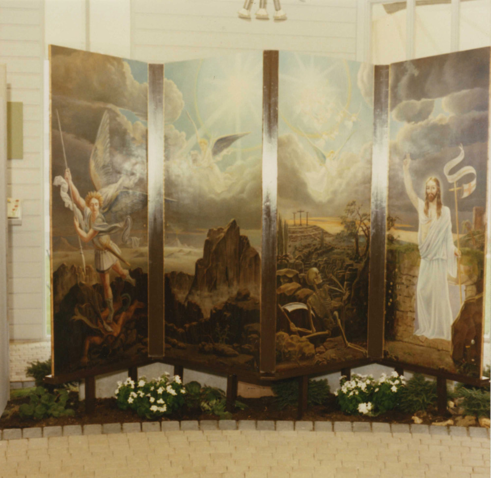 Foto van Kollaart die in de koepel bezoekers een toelichting bij zijn schilderijen geeft