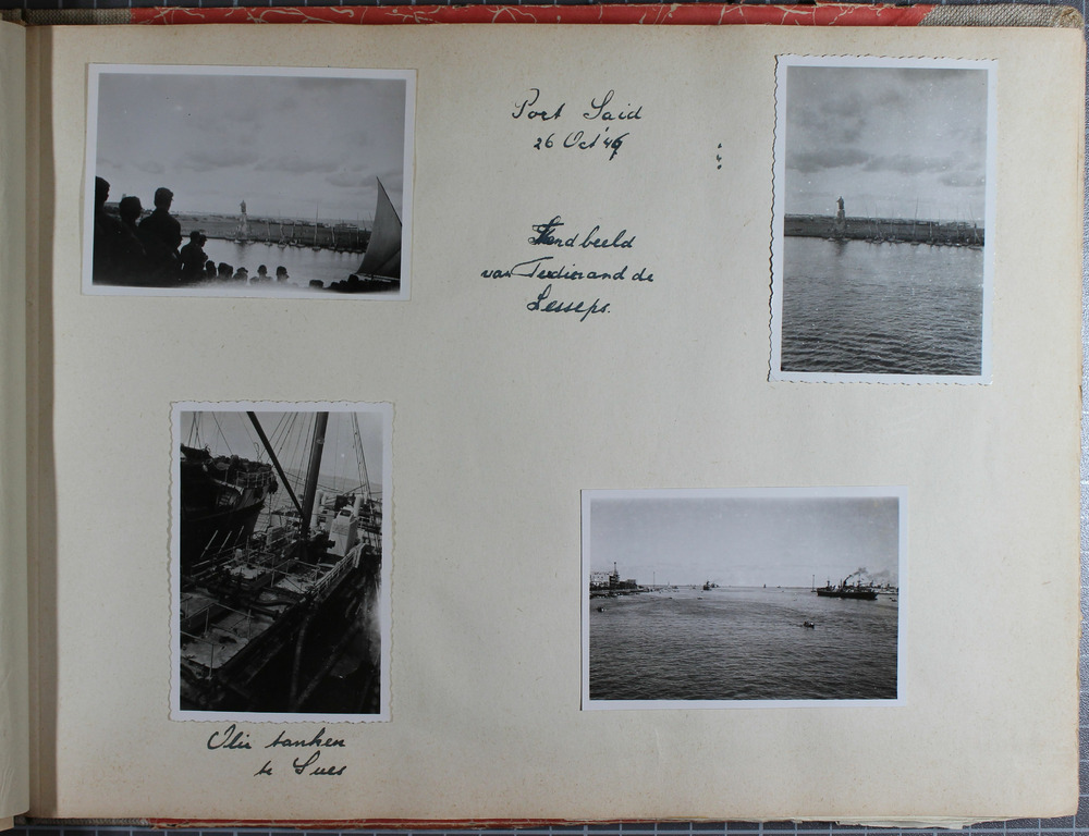 Pagina uit het amateur fotoalbum “Indië 16 October 1946 t/m 28 December 1949” van soldaat I.N.J. Janssen. Het album toont het vertrek uit Nederland en de reis naar Indonesië. Aankomst in Tandjong Priok op 12 november 1946. Janssen verblijft vernamelijk in Andir, West-Java, en later in Medan, Noord-Sumatra. De foto’s tonen vooral het dagelijks leven, de plaatselijke bevolking en het landschap.