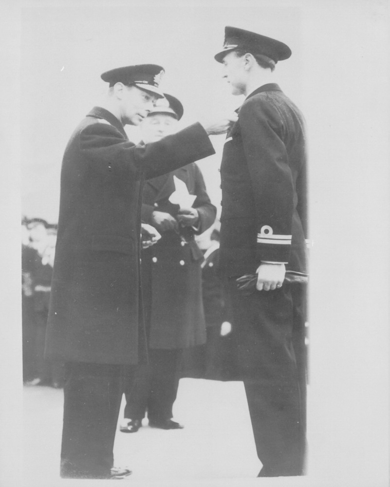 King decorates naval officers and men. The King decorating Lieutenant R.C. Lewis with the D.S.O. for work in connection with the recovery of German mines from the sea. Koning George VI.